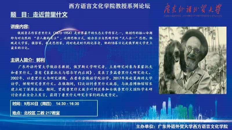 本网讯 2012年9月30日下午,广东外语外贸大学西方语言文化学院教授系列论坛第一期在广外北校区二教217教室举行。本期由广东外语外贸大学西方语言文化学院俄语系郭利教授带来题为《走近普里什文》的专题讲座。讲座由副院长杜卫华和研究生办公室主任臧宇主持,西语学院各系研究生参加。