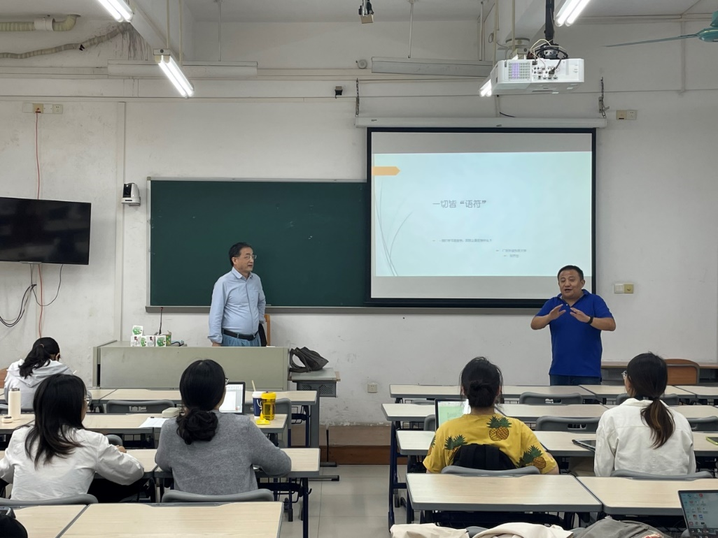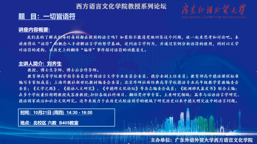 本网讯 10月21日下午,广东外语外贸大学西方语言文化学院教授系列论坛第二期在六教B405教室举行。本期由广东外语外贸大学西方语言文化学院德语系刘齐生教授主讲《一切皆“语符”》。讲座由研究生办公室主任臧宇老师主持,辅导员张阳老师协助,西语学院各学位点研究生参加。