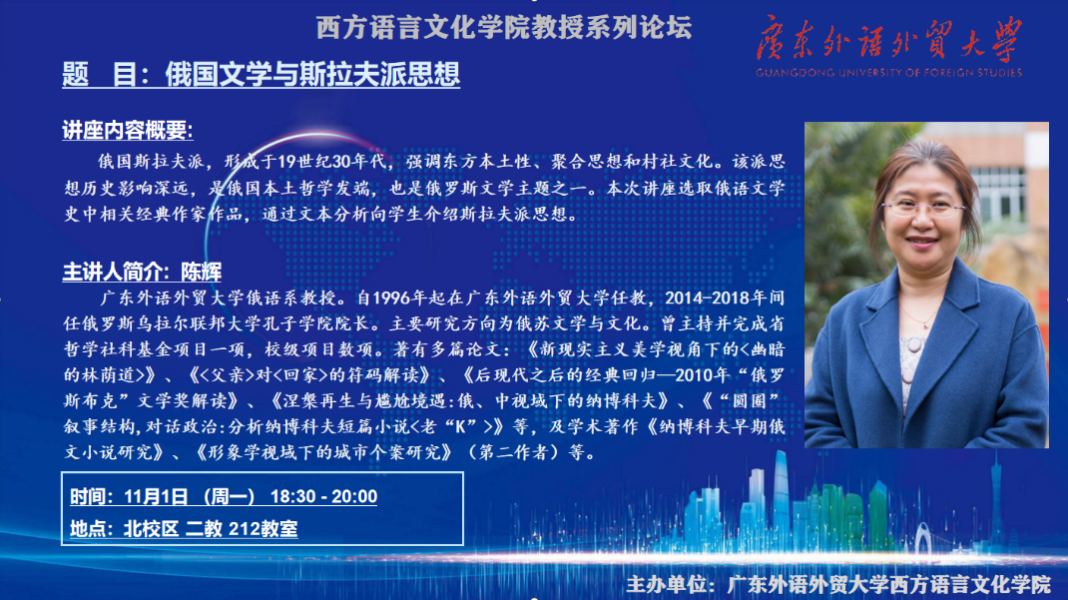 本网讯 11月01日晚上,广东外语外贸大学西方语言文化学院教授系列论坛在二教212教室举行。本期专题论坛是西方语言文化学院俄语系陈辉教授带来的《俄国文学与斯拉夫派思想》。讲座由研究生办公室主任臧宇老师主持,西语学院各培养点研究生出席。