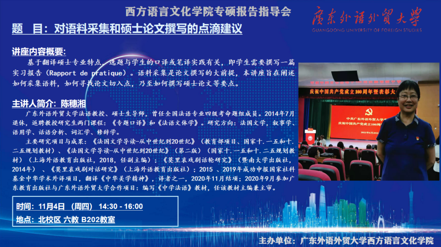 本网讯 11月4日下午,广东外语外贸大学西方语言文化学院专硕报告指导会在北校区六教B202室举行。本期指导会由西方语言文化学院法语系陈穗湘教授主讲,题为《对语料采集和硕士论文撰写的点滴建议》。讲座由法语系陈湘蓉老师主持,西语学院杜卫华副院长出席本次指导会并讲话,西语学院法语、德语、俄语、西班牙语专业硕士生积极参加,教室里座无虚席。