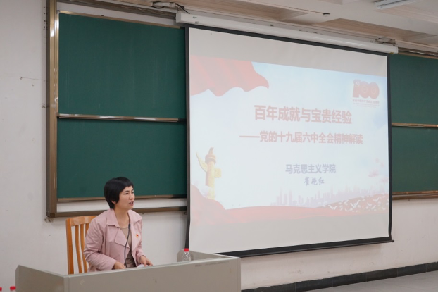 崔艳红教授围绕党的十九届六中全会概况、全会召开的背景、《中共中央关于党的百年奋斗重大成就和历史经验的决议》的主要内容与重要内涵、中国共产党百年奋斗的历史意义与历史经验等四个方面进行了精彩纷呈的阐述。她指出,党的十九届六中全会从党和国家事业发展的战略全局出发,深入研究党领导人民进行革命、建设、改革的百年历程,全面总结党从胜利走向胜利的伟大历史进程、为国家和民族建立的伟大历史功绩,审议通过了《中共中央关于党的百年奋斗重大成就和历史经验的决议》。