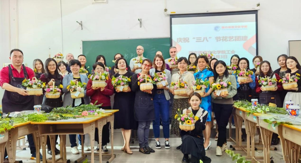 外籍教师和同事们一起在满屋花香中互动交流,感受亲手插花带来的乐趣,体验着西语大家庭的温暖。
