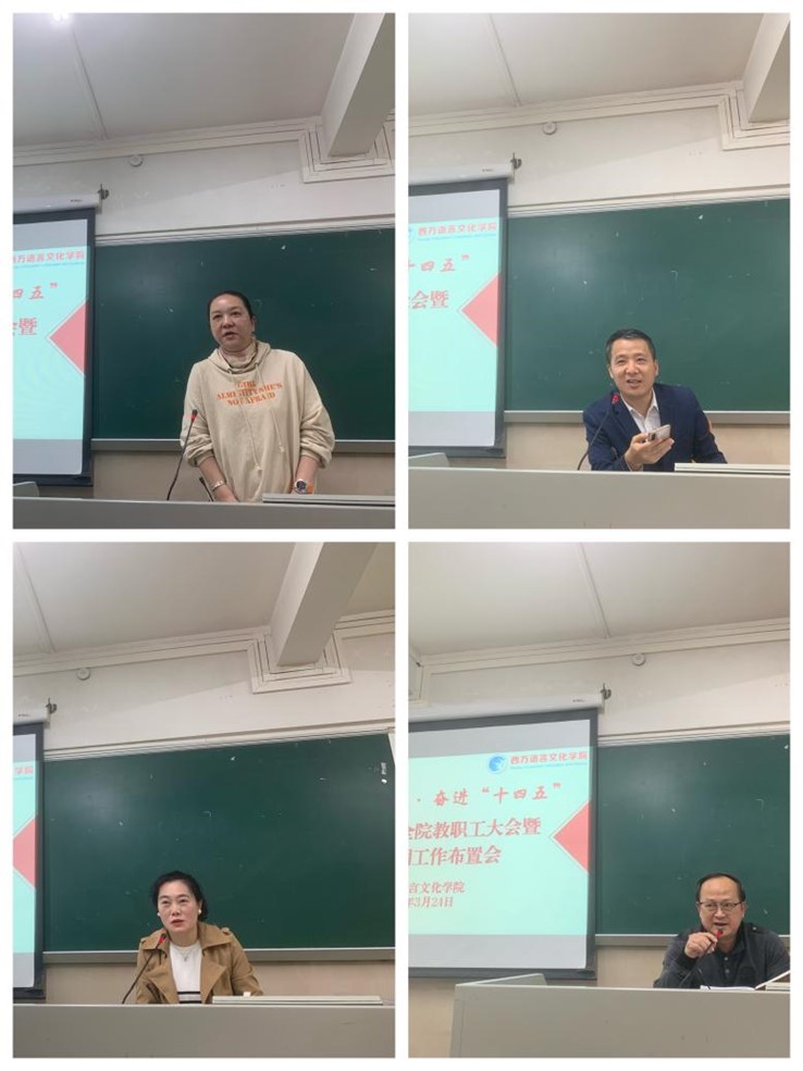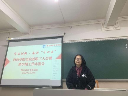 3月24日下午,西语学院在二教131教室顺利召开主题为“守正创新,奋进‘十四五’”的全院教职工大会暨新学期工作布置会。学院领导班子、全院教职工80余人出席了会议。会议由西语学院党委书记敖湘晖主持。