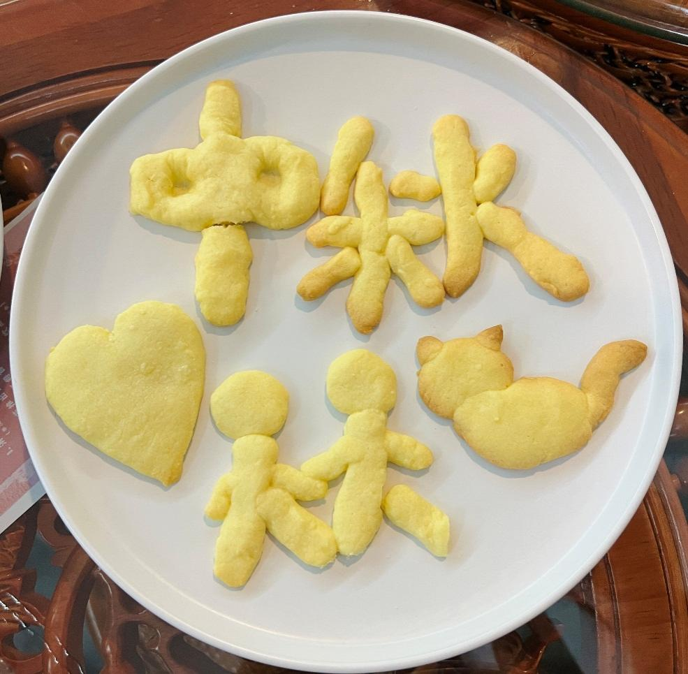 随后,老师们五人一组,开始制作曲奇。组员们纷纷发挥自己的想象与创造力,将黄油面团揉捏塑造成各种形状并绘上特色花纹。半成品摆上桌,大家互相欣赏并帮忙完善,其乐融融。