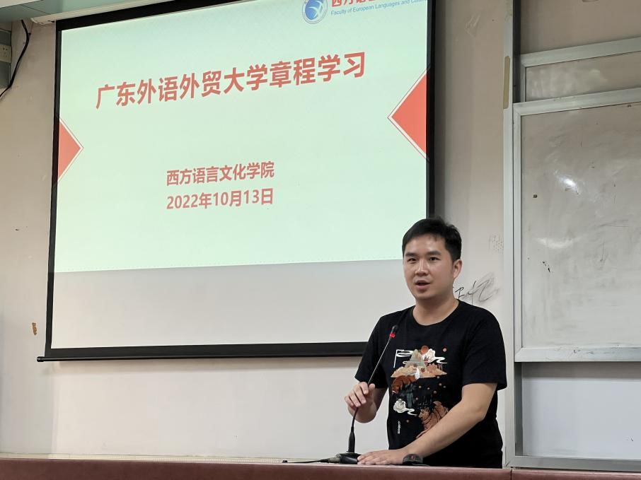 2022年10月13日下午,西语学院在四教424教室召开了《广东外语外贸大学章程》专题学习会。会议由西语学院党委书记敖湘晖主持,西语学院办公室主任谢石顺向西语学院全体教职工讲解了广东外语外贸大学2022年版章程的重点内容。