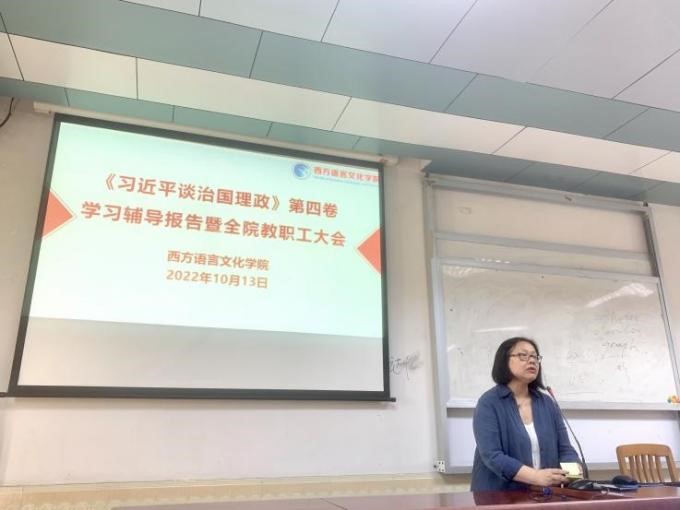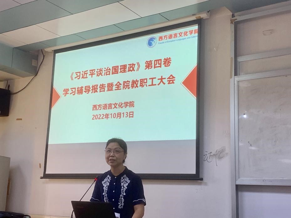 2022年10月13日下午,西语学院在四教424教室召开了《习近平谈治国理政》第四卷学习辅导报告暨全院教职工大会。会议邀请了马克思主义学院宋善文教授开展了题为“对‘三大时代课题’的新拓展——学习《习近平谈治国理政》第四卷”的专题辅导报告。会议由西语学院党委书记敖湘晖主持。
