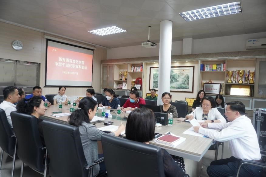 11月17日下午,西方语言文化学院中层干部任职宣布会议在四教会议室召开,校党委常委、副书记李云明、西语学院领导班子全体成员及系部(办)主任参加会议。会议由敖湘晖主持。