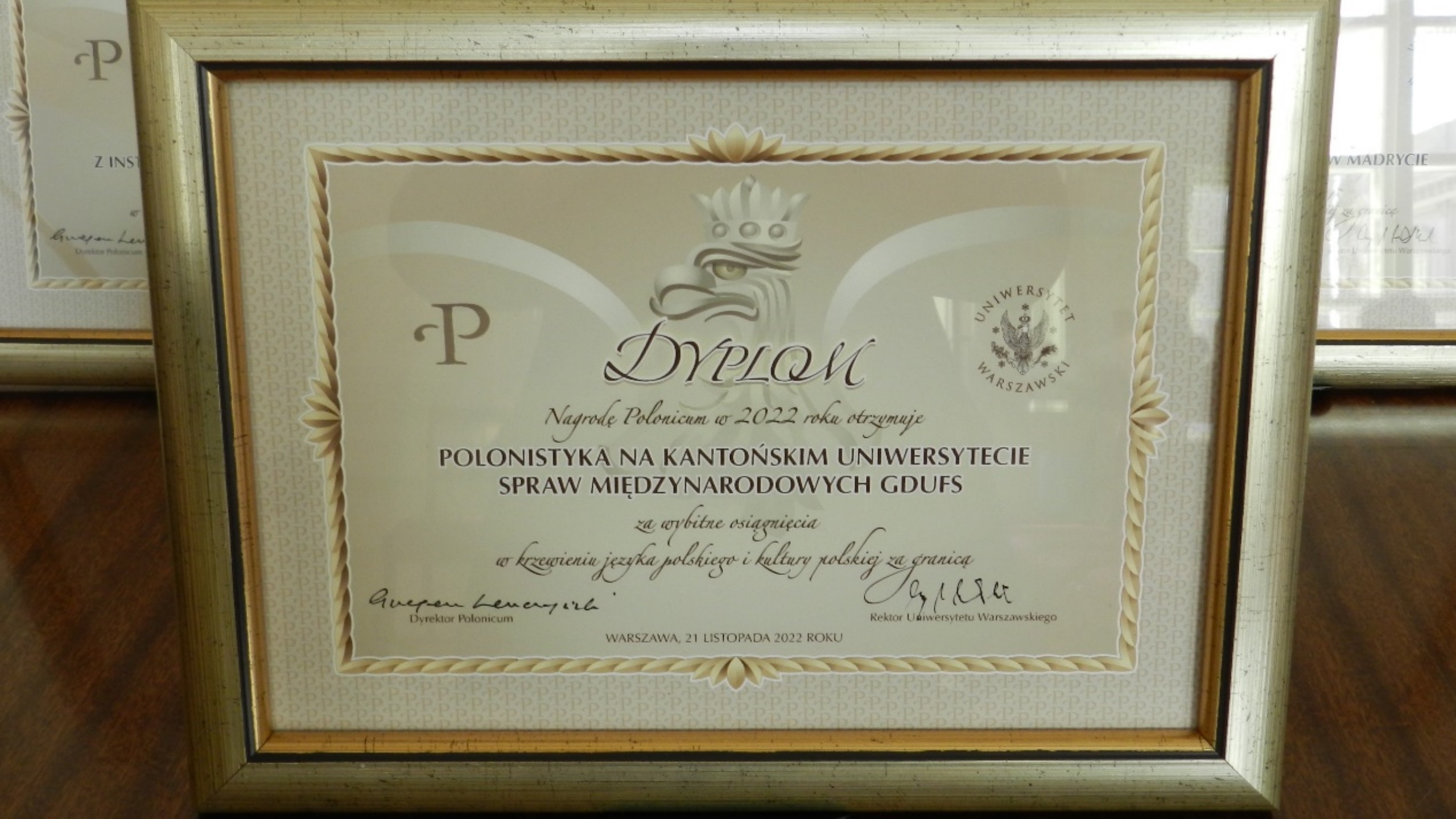 本网讯 11月21日,波兰华沙大学向我校波兰语专业颁发了“2022年度波兰语言文化国际传播奖”(下称“POLONICUM奖”)。该奖项由波兰顶尖名校华沙大学设立,旨在表彰在世界范围内对波兰语言、文学、历史和文化的传播产生杰出贡献的单位及个人。该奖项规格极高,评审委员会成员包括华沙大学校长、波兰共和国参议院议长、波兰文化和国家遗产部部长、波兰高等教育部部长等。