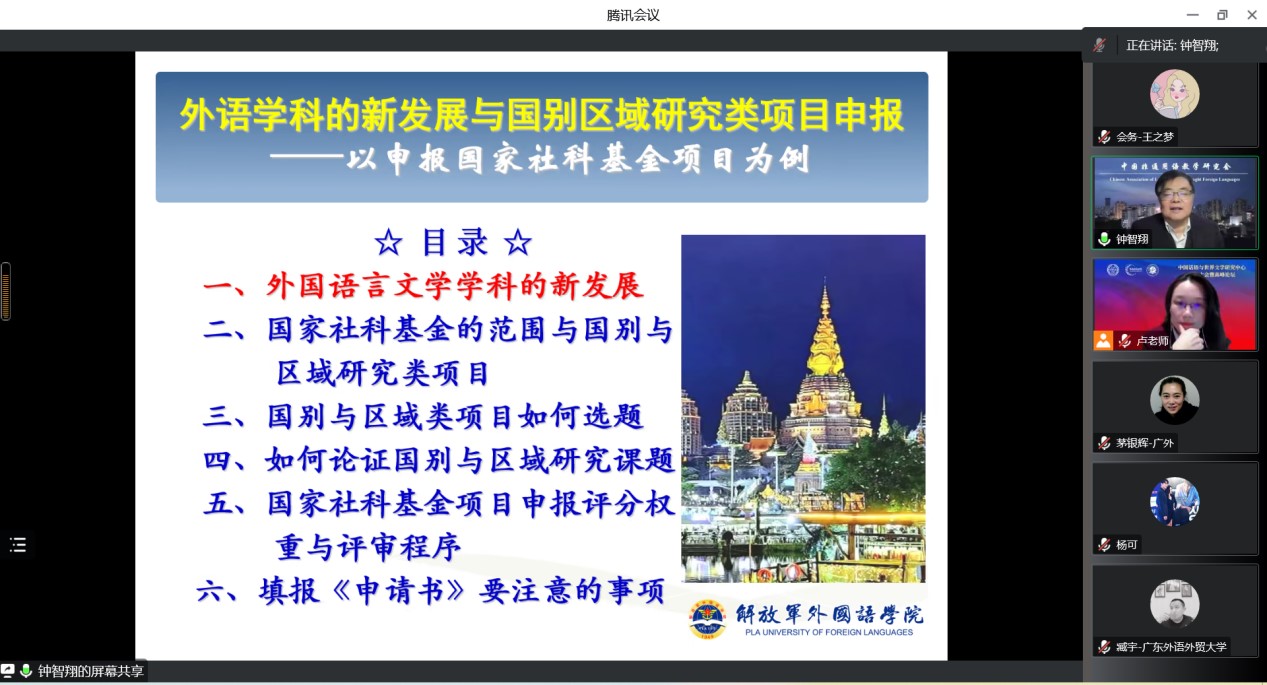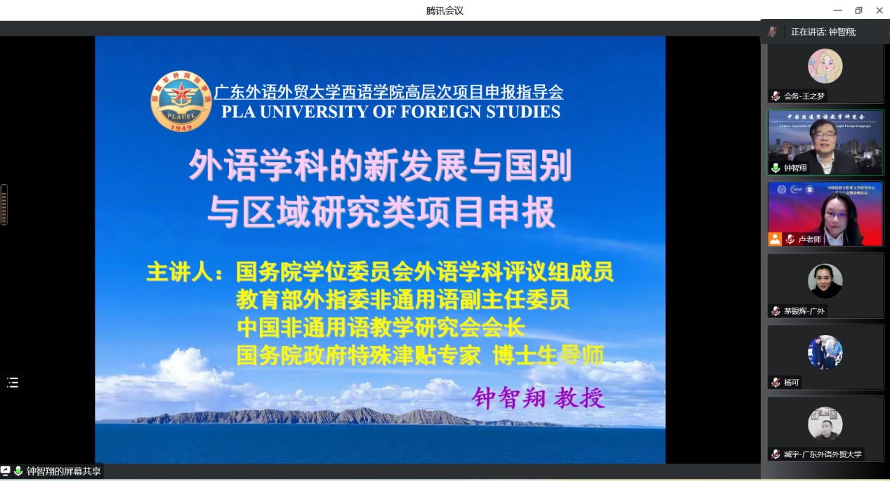本网讯 12月27日晚,西语学院举办2023年度高层次项目申报第二次指导会,信息工程大学钟智翔教授应邀针对国家社科基金项目申报作了题为“外语学科的新发展与国别区域研究项目申报”的指导。近40位教师通过腾讯会议参与此次指导会,会议由卢铭君副院长主持。