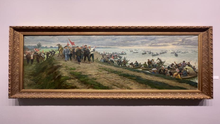 1956年,恽老以洪湖地区革命斗争故事为主题,创作了油画《洪湖黎明》,画中赤卫队员由陆路向大堤开进,主体在画面的左上方,展示赤卫队大部队的连绵不绝,彰显出革命力量已蓄势待发,终将迎来灿烂的黎明。89岁的时候仍在坚持创作,又完成了一幅以朝阳为主题的洪湖画作《洪湖红》,从“黎明”到“朝阳”,寄托了恽老对洪湖百年沧桑巨变最深沉的礼赞。