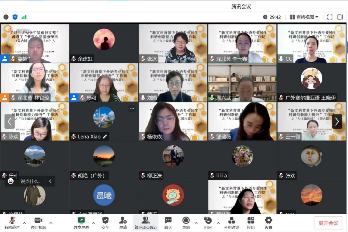 为了进一步提高师生的科研创新意识与能力,加强与各学术期刊的联系,2023年5月23日,我院与深圳北理莫斯科大学语言系共同组织的“新文科背景下外语专业师生科研创新能力提升”工作坊之“与主编连线”活动在线上顺利举行。应邀参与此次活动的嘉宾有《俄罗斯文艺》主编刘娟教授、《中国俄语教学》副主编张冰教授、《欧亚人文研究》主编蔡晖教授、《中国斯拉夫研究》主编戴桂菊教授。连线活动由期刊介绍环节和交流环节两部分组成,第一个环节由深北莫语言系周兴武副主任主持,第二个环节由广外俄语系陈欢主任主持,广外俄语系杨可教授做了开场和总结发言。