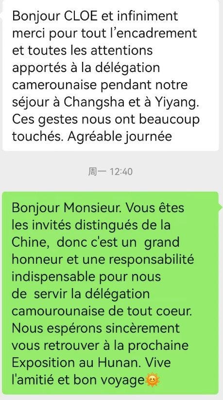 喀麦隆驻华大使馆参赞恩东嘎先生:“闵哲你好,在长沙和益阳会议期间,非常感谢你们对喀麦隆代表团给予的所有关心与支持。为此,我们深受感动。祝好。”
