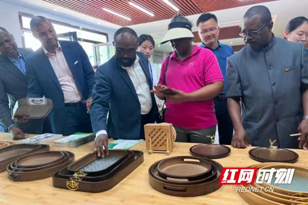 闵哲(后排左一)接待喀麦隆商务部长Luc Bienvenu Magloire MBARGA ATANGANA一行,在参观益阳市祥和竹业公司时进行讲解翻译。