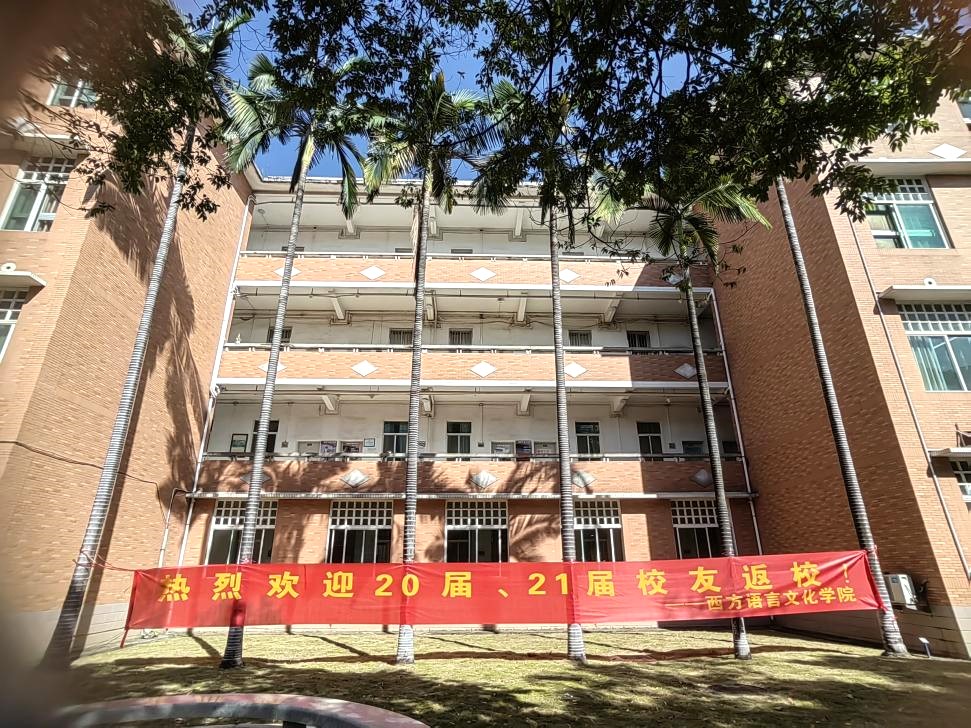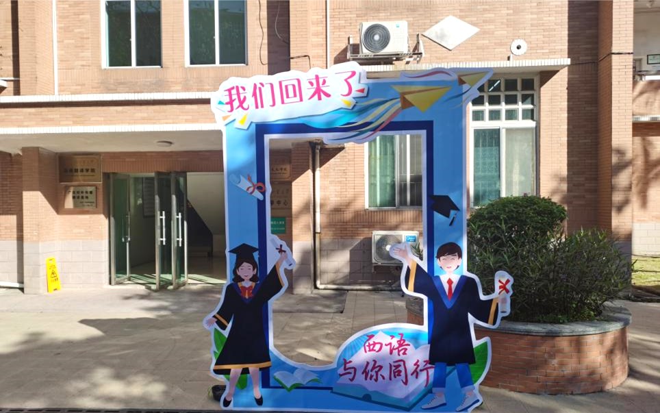 第四教学楼前,“热烈欢迎2020届、2021届校友返校”的横幅高高悬挂,一抹红色与今天的暖阳相映,增加几分青春气息;教学楼门口“欢迎回家”的打卡点处,校友们和亲属们拍照留念,绽放着流星般光彩灿烂的笑靥;教学楼迎接校友的教室内,校友欢聚一堂,共同回忆着昔日同窗之情,分享着在母校的温馨点滴,也共同叙述着彼此美好的未来;师生见面,欣喜相拥,眼里跳动的是久别的惊喜和想念。秋日的暖阳,在教学楼前的青草绿树上照耀着,点点光斑透过缝隙洒落在地上,铺出一条回西语学院大家庭的路,秋风拂面,轻柔相迎,无不展示着西语学院对校友回家的热烈欢迎。