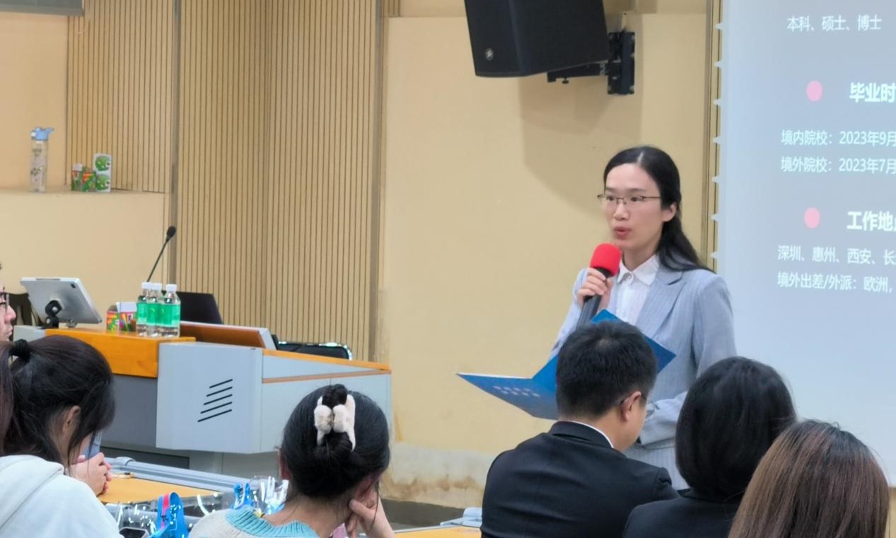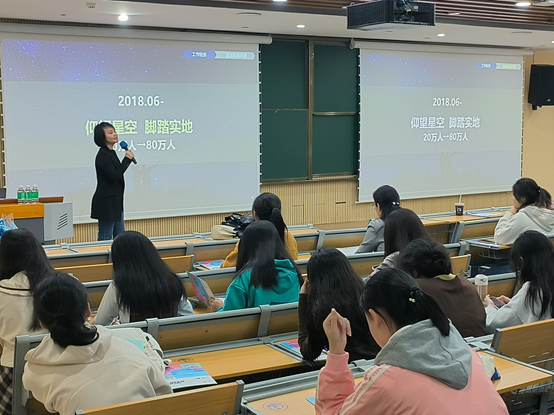 作为西语学院94级西班牙语系的优秀校友,王珍从个人成长经历、全球宏观环境、比亚迪发展历史和产业布局、比亚迪的用人需求四个方面给同学们进行了分享。王珍指出,青年需要树立远大志向,既仰望星空,又脚踏实地,在校园里锻炼自己的底层逻辑思维能力、沟通协调能力、跨文化交际能力,才能在初入职场时拥有更大的舞台。王珍用详细的数据展示了全球经济形势,强调不管是企业,还是个人,要以解决社会问题为导向,在解决问题的过程中发展自己。