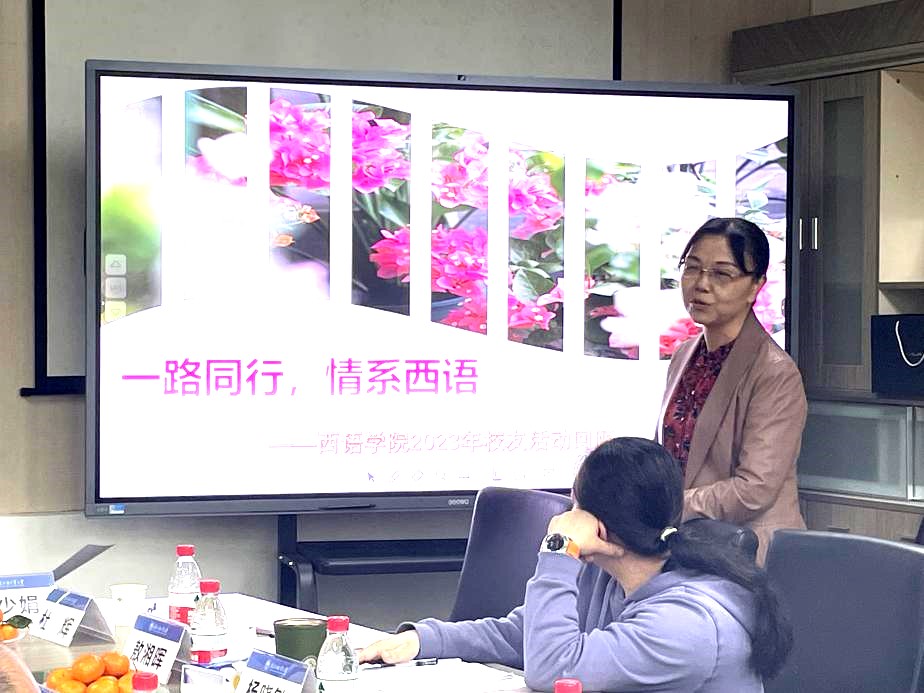 会议初始,学院党委五级组织员、校友会常务副会长敖湘晖和校友会执行秘书长黄兆荣校友分别作2023年西语学院校友会工作回顾,从“校友交流,共议学院发展”、“校友风采,共促人才培养”、“朋辈引领,共聚榜样力量”等方面带领大家共同回忆今年校友会工作的点点滴滴。