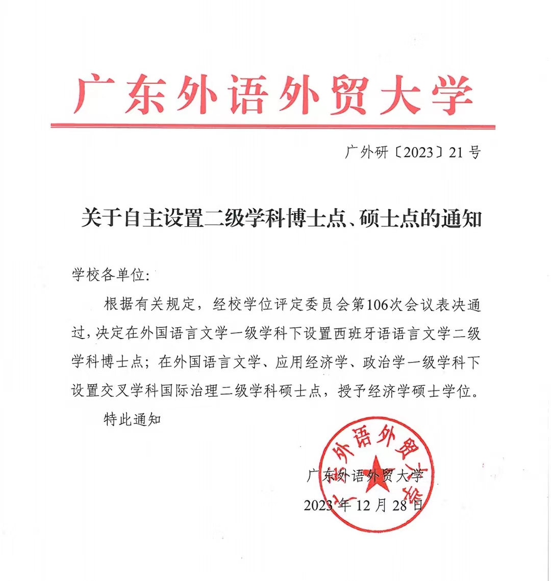经长期筹备、校内外专家多次指导论证,广东外语外贸大学学位委员会第106次会议表决通过,西方语言文化学院获准设立西班牙语语言文学二级学科博士点。作为广外历史最为悠久的专业之一,西班牙语从此具备了本、硕、博完整的高等教育培养体系。随着该培养点的建立,西语学院的二级学科博士点数量增至4个,广外也成为全国仅有的几所具备西班牙语博士培养资质的高校之一。