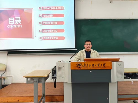 王永康从自身经验出发,给同学们介绍了国际中文教育组织和机构,详细讲解了志愿者的选拔、工作日常、工作待遇和未来发展等方面,非常具有指导意义。他列举了国际中文教师志愿者选拔的三大测试分别为心理测试、中文面试和外文面试,并一一讲解了其中要点,实操性很强。他展示了国际中文教师志愿者充实而精彩的工作生活日常,激发了同学们的兴趣。