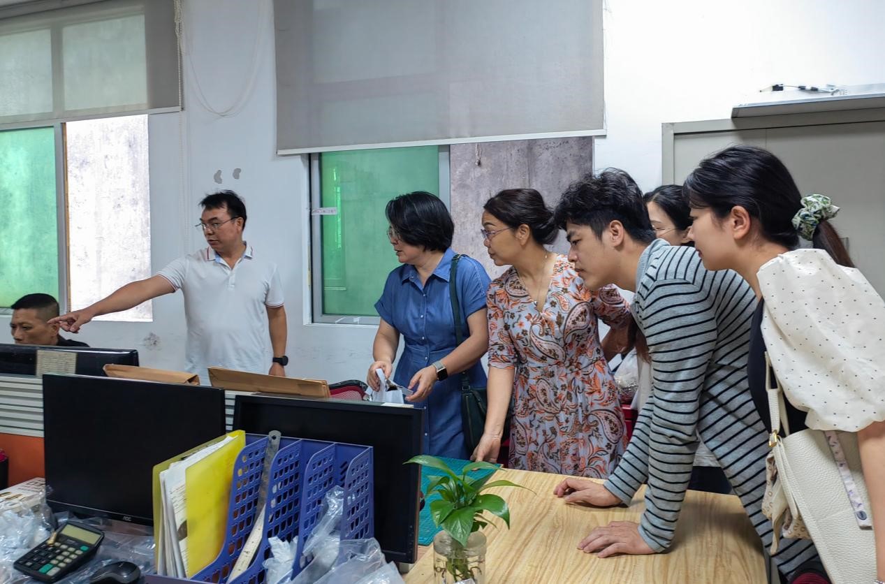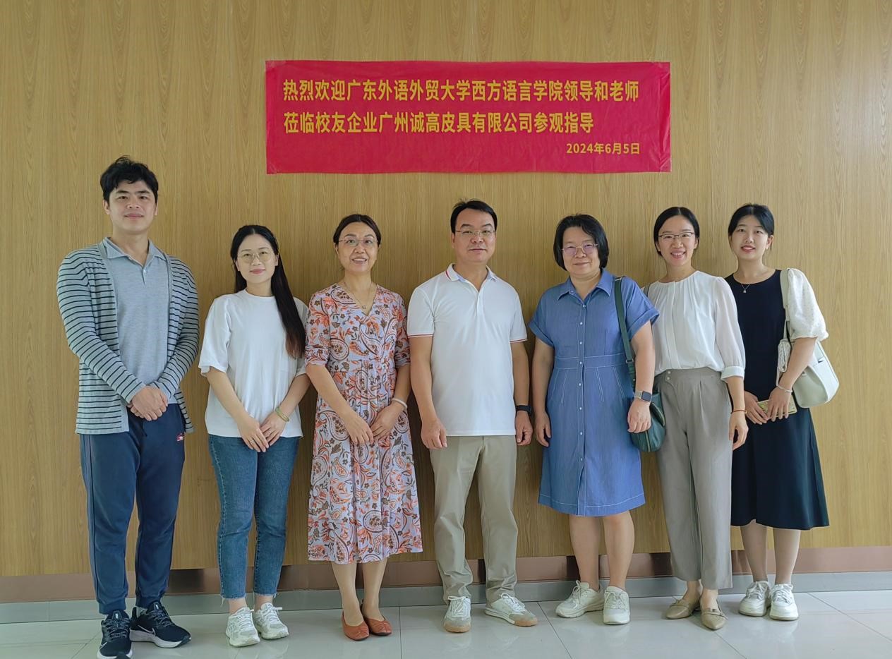 本网讯 为深化校企合作,6月5日,西语学院党委书记王秀民带队,学院五级组织员敖湘晖、党委副书记魏少娟,以及辅导员倪娉婷、冯迪南、张阳一行走访了位于花都区的校友企业广州诚高皮具有限公司。诚高皮具负责人、广外西语92级校友林业伟热情接待了来访团队。
