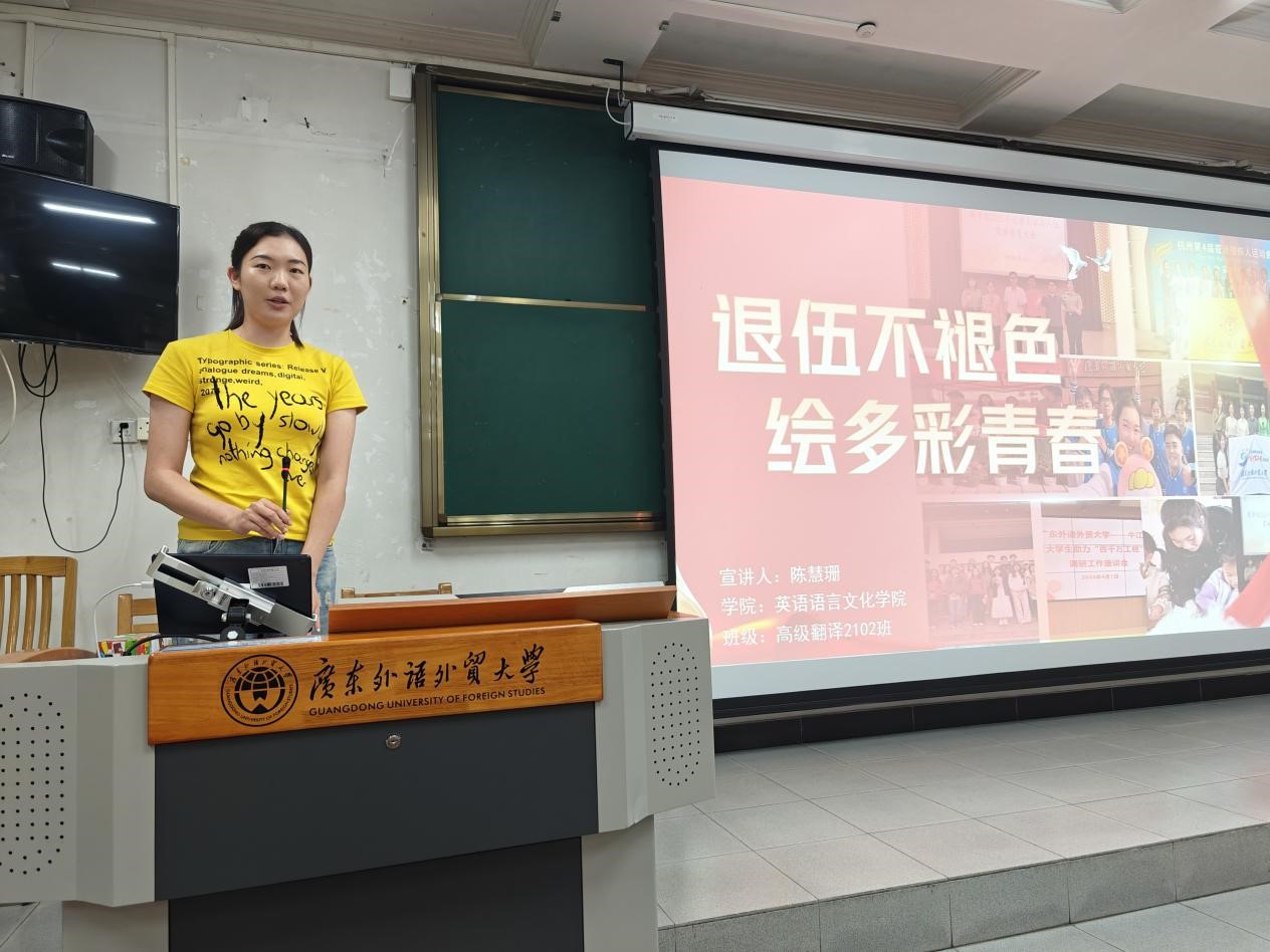 陈慧珊分享了自己的当兵经历。她曾在边防服役,当兵两年,面对严寒的环境和艰苦的训练,充分展现了当代大学生的素质和能力,通过坚持和努力,从一个什么都不懂的新兵,很快脱颖而出,在体能和技术上都取得了显著进步,获得了部队的认可并取得一系列荣誉。退役后,陈慧珊将在军队中培养的纪律、毅力、坚韧和强烈的责任感带回校园和社区,积极组织和参与志愿活动,完美完成了从”迷彩绿”到”志愿红”的转变,自己也成为一个主要学生骨干。在分享的最后,陈慧珊鼓励同学们勇担使命,敢于尝试,不畏艰难,从小事做起,积累经验,成就大事。