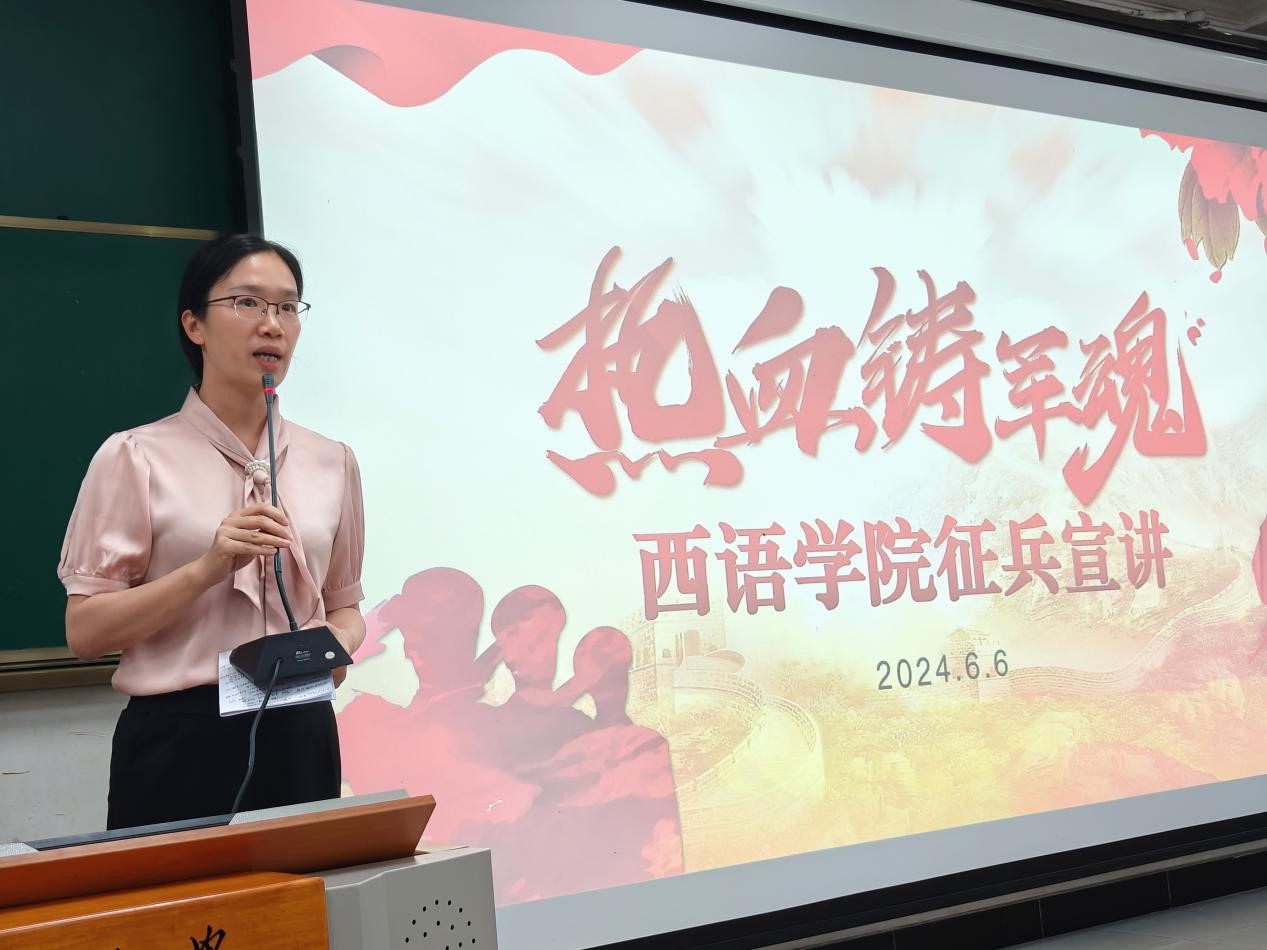 本网讯 强国必先强军,军强才能国安。为了增强同学们的国家安全意识,普及征兵政策,6月6日下午,西语学院在二教114开展“热血铸军魂”大学生退役士兵分享和征兵宣讲活动。本次活动邀请了保卫部张雪老师,退役士兵、英文学院21级陈慧珊同学主讲。西语学院党委副书记魏少娟、辅导员张阳、西语学院及北校区各学院约100名学生参加。