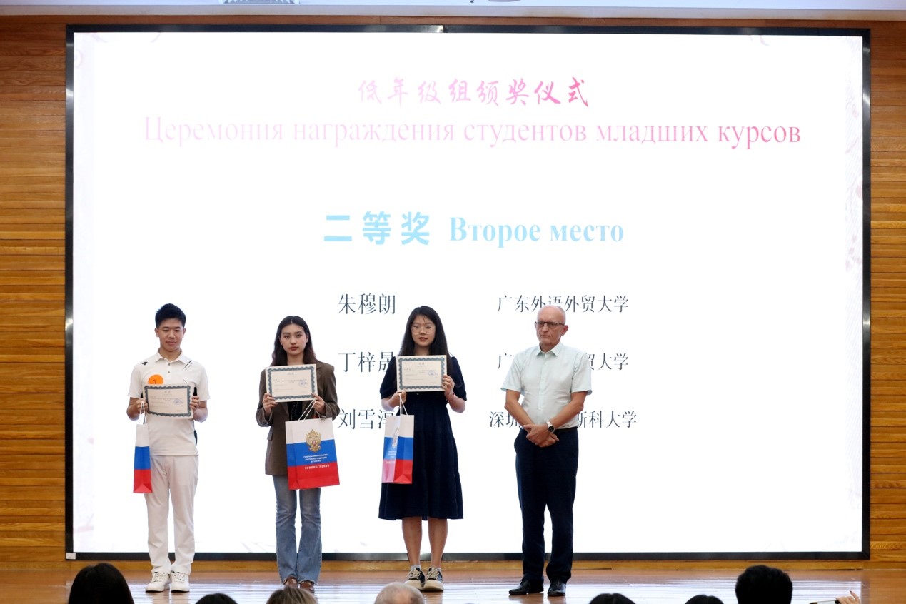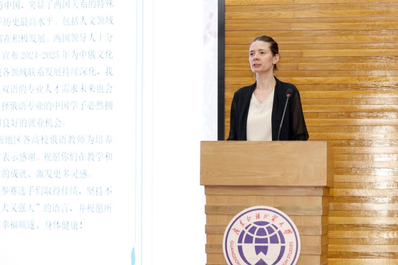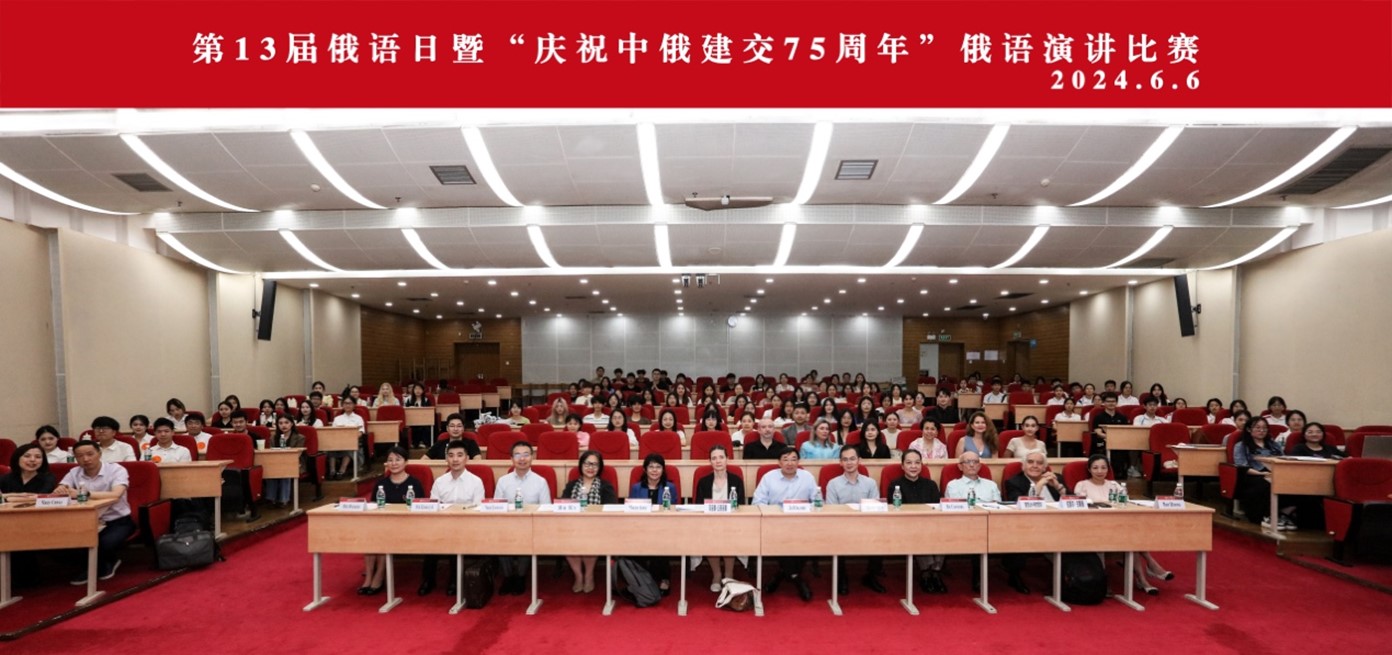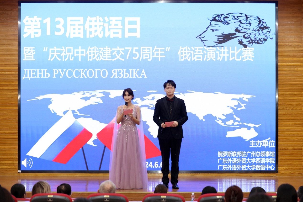 2024年6月6日下午,第13届“俄语日”暨“庆祝中俄建交75周年”俄语演讲比赛在我校白云山校区图书馆报告厅成功举办。本次活动由俄罗斯联邦驻广州总领事馆、广东外语外贸大学西语学院及广东外语外贸大学俄语中心共同主办。出席本次“俄语日”的嘉宾有广东外语外贸大学党委副书记李云明、俄罗斯联邦驻广州总领事馆领事玛丽娜·丘穆丽娜、广东外语外贸大学国际交流与合作部部长周鹏、广东外语外贸大学西方语言文化学院院长杨晓敏、广东外语外贸大学宣传部副部长费俊慧等。活动特邀俄罗斯联邦驻广州总领事馆领事玛丽娜·丘穆丽娜、中国俄罗斯东欧中亚学会俄语教学研究分会秘书长张冰、广东外语外贸大学原俄语中心主任杨可、世界俄语教学研究会原主席团成员及西班牙格拉纳达大学斯拉夫语文系教授拉斐尔·古斯曼、深圳北理莫斯科大学语言系主任亚历山大·列杰涅夫、南京大学外国语学院副院长张俊翔、广东外语外贸大学南国商学院西方语言文化学院院长于凤颖、华南师范大学俄语系主任汪隽担任演讲比赛评委。参加此次活动的还有来自广东外语外贸大学、中山大学、华南师范大学、深圳北理莫斯科大学、广州大学、广东外语外贸大学南国商学院等高校及佛山市顺德区龙江中学的师生代表。