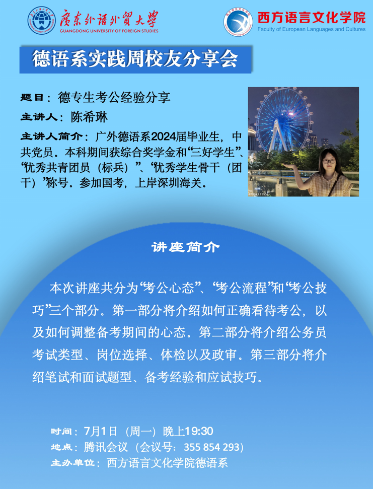 此次分享会不仅加深了学生们对考公,考研,实习的理解,也为他们的人生规划提供了宝贵参考。西方语言文化学院德语系将继续致力于提供更多高质量的实践机会,助力每一位学子在学术,职场的天空中翱翔。