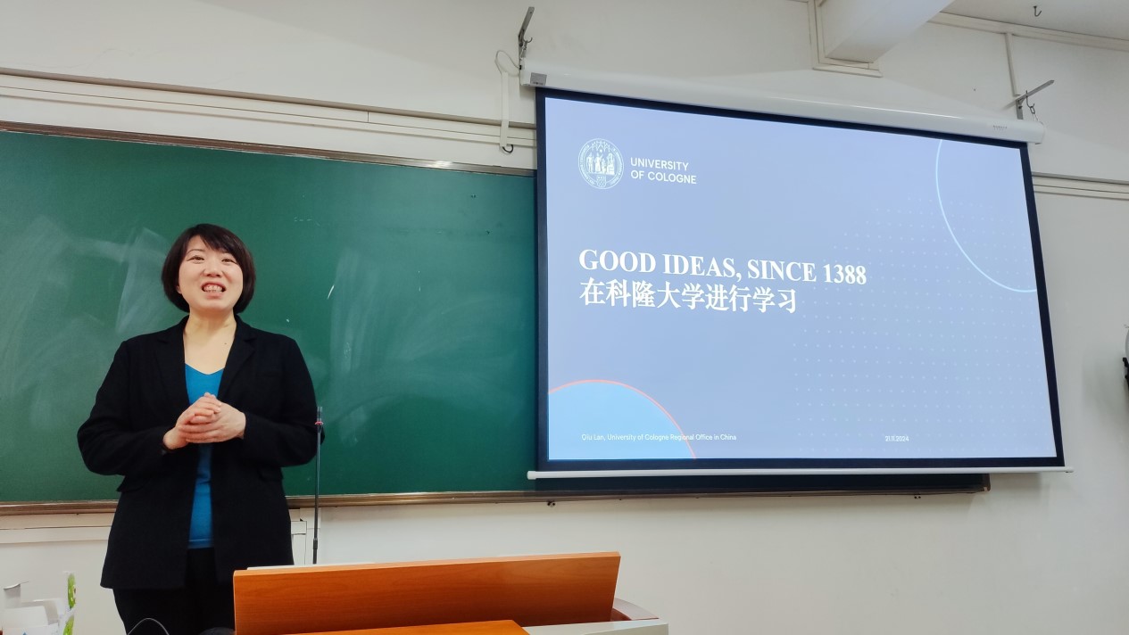 科隆大学北京代表处邱岚老师向在场学生介绍了科隆大学的悠久历史、学术资源、研究项目、申请程序以及校园文化等,让学生对在科隆大学的学习与研究有更深入的了解。她指出,科隆大学不仅注重学术成就,也重视学生的个人发展和社交体验,致力于为学生创造一个多元化和包容性的学习环境。同时,邱老师还对中国—北威州大学联盟的成员学校进行了详细介绍。