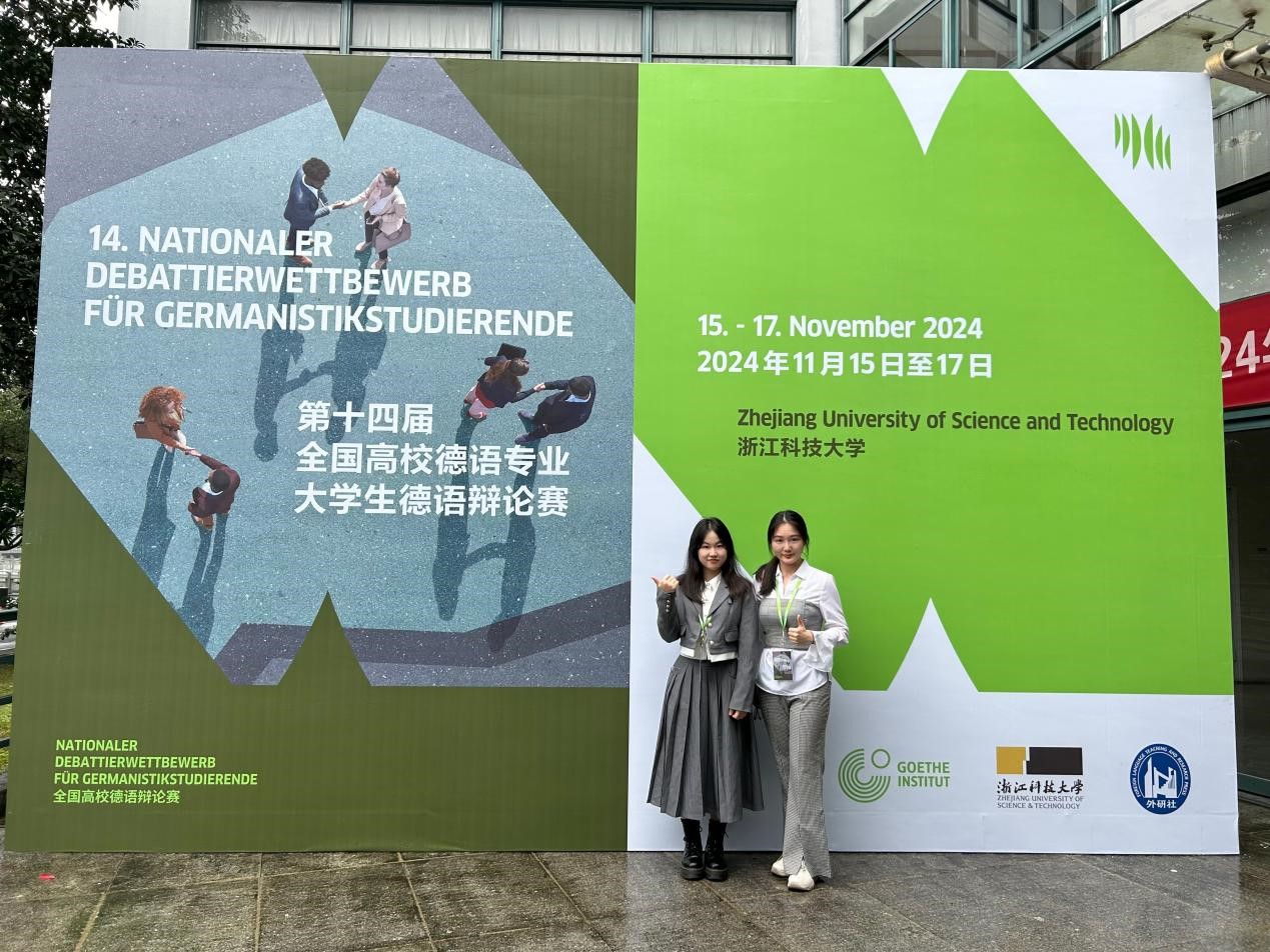 2024年11月17日,我院德语系江林颖同学和张赫菱同学在第十四届全国高校德语专业大学生德语辩论赛中荣获全国三等奖。本次比赛由北京德国文化中心·歌德学院(中国)主办,浙江科技大学和外语教学与研究出版社(FLTRP)承办,决赛于浙江科技大学举行。上述两位同学得到黄羽欢老师、吴晓钢老师和Ingo Koester老师的共同指导。