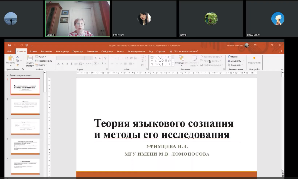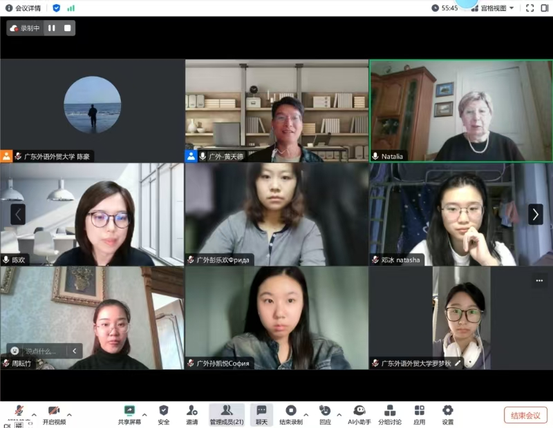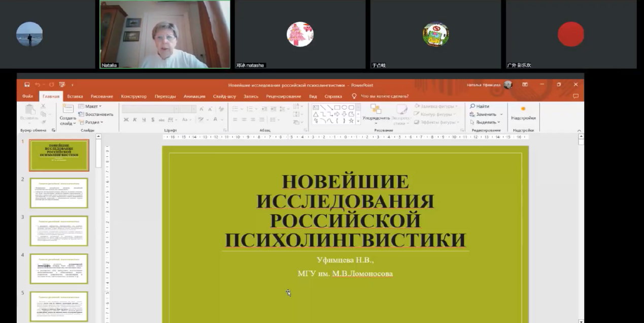 乌菲姆采娃教授虽无法亲临广外现场授课,但她线上的精彩讲座给俄语系师生留下了深刻影响,使大家受益匪浅。本次系列讲座不仅有广外师生参加,同时也受到了国内外高校相关领域学者的关注。听众来自莫斯科大学、圣彼得堡大学、伯明翰大学、黑龙江大学、东北林业大学、北京大学、兰州大学、西北大学、西安外国语大学、复旦大学、武汉大学、中山大学、广西民族大学、新疆师范大学、哈尔滨师范大学、东北师范大学、北京师范大学、河南师范大学、华中师范大学、华南师范大学等二十余所国内外知名院校。该系列讲座水平高、专业性强,让听众对俄罗斯心理语言学的理论、研究方法以及发展前景有了更为全面深刻的了解,既激发了师生们的学术兴趣和科研热情,也为广外俄语一流本科专业建设及俄语语言文学硕士点的建设开辟了新路径。