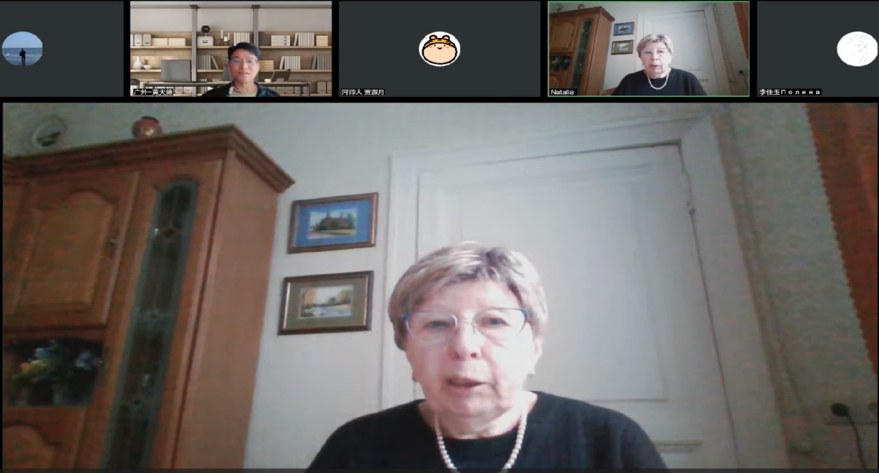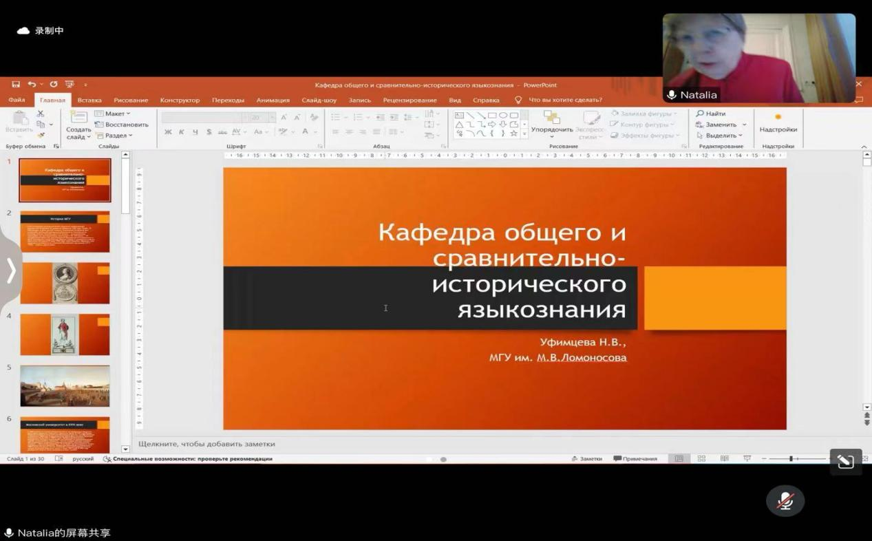 讲座伊始,乌菲姆采娃教授详细介绍了莫斯科国立大学的发展历史。随后,乌菲姆采娃教授细致地介绍了历史比较语言学教研室的发展历史和现状,展示了该教研室深厚的历史底蕴和学术成就。讲座最后,乌菲姆采娃教授与师生们连线、积极互动。乌菲姆采娃教授以自身丰富的研究经验与大家就相关问题进行了深入探讨。本次讲座圆满落幕。