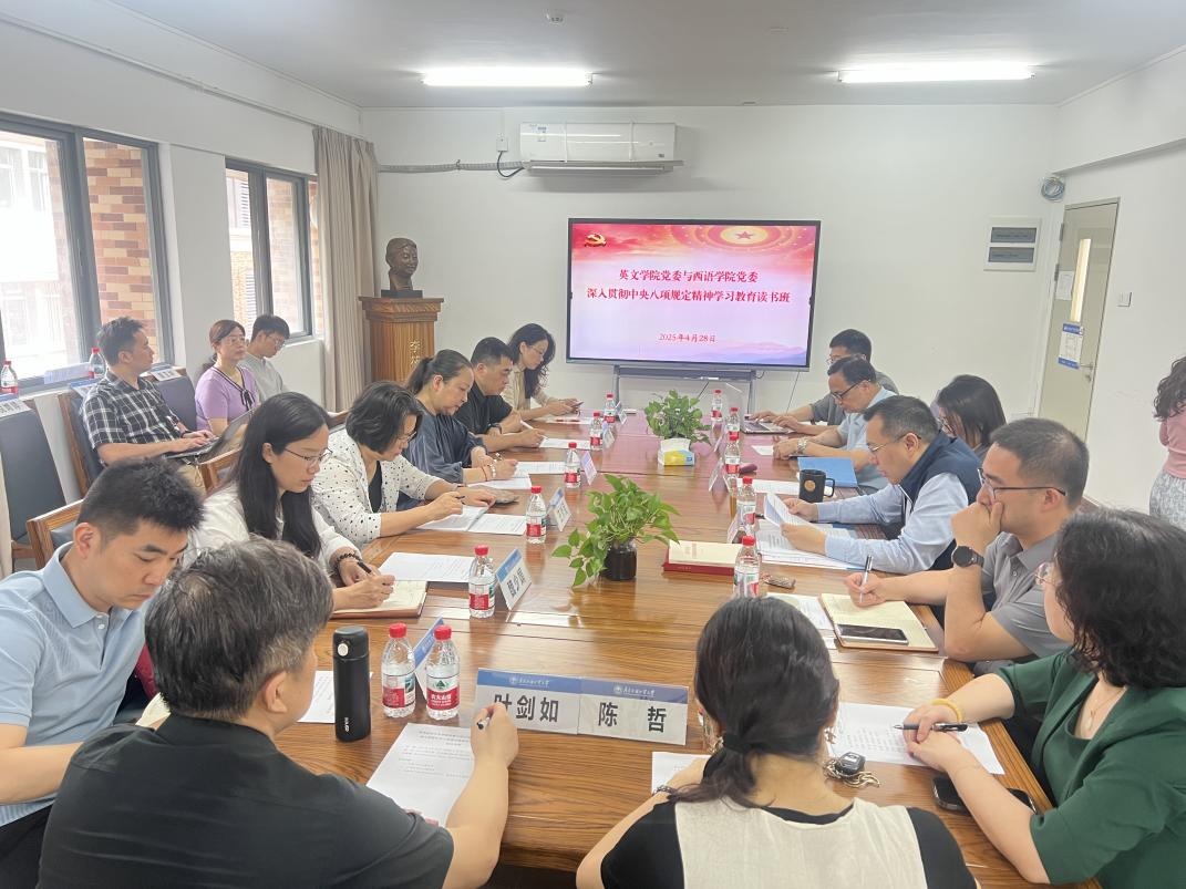 为深入贯彻中央八项规定精神学习教育,进一步推动作风建设走深走实,2025年4月28日,西方语言文化学院党委与英语语言文化学院党委联合举办深入贯彻中央八项规定精神学习教育读书班。本次活动以作风建设与学科建设深度融合为主线,通过联学共研凝聚发展共识,开启两院协同发展新篇章。