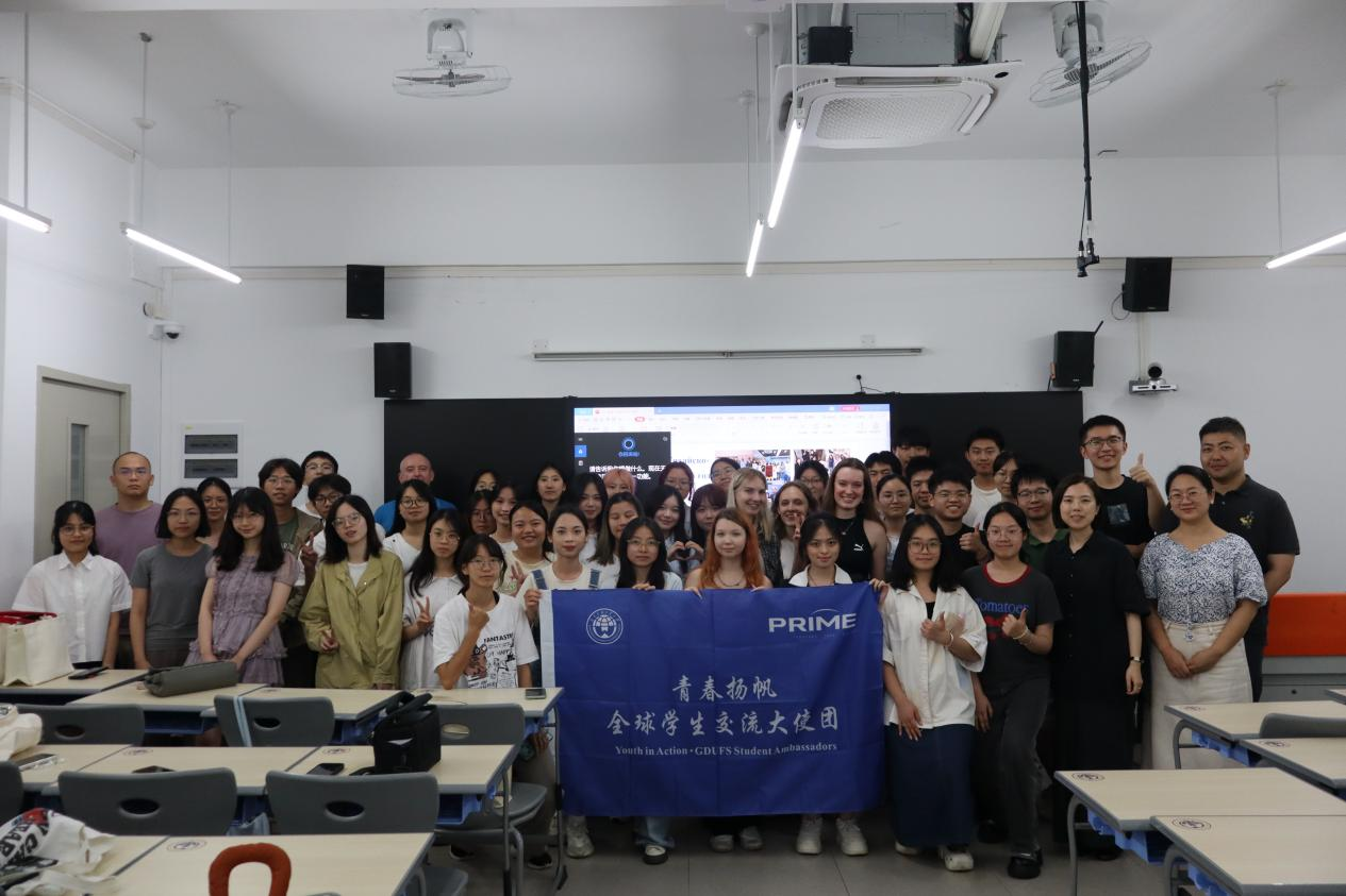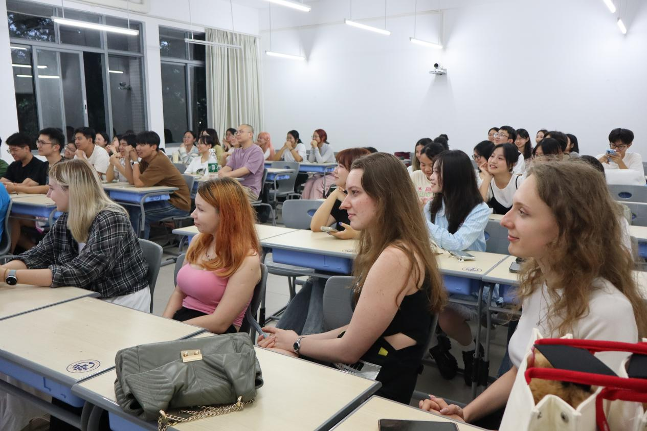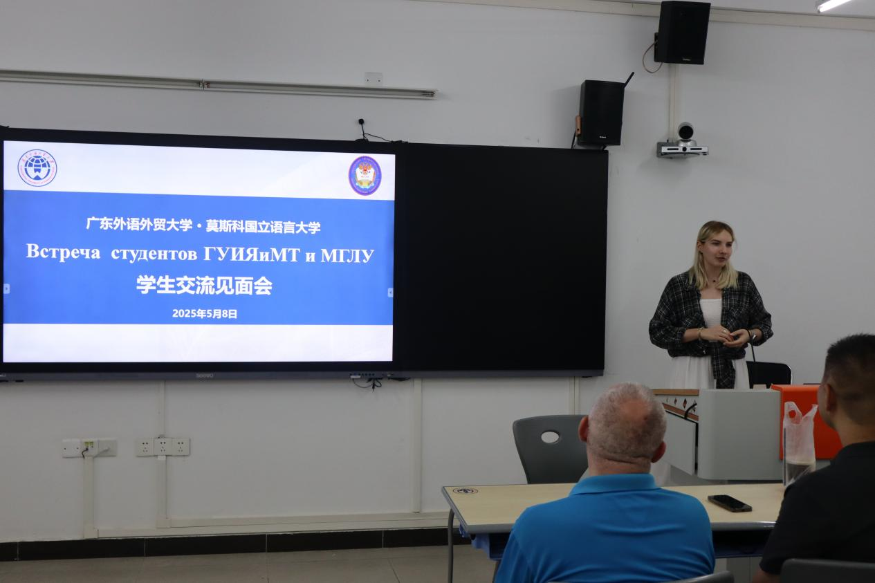本网讯 2025年5月8日晚,为更好落实我校国际交流合作“PRIME计划”,并进一步推进国际化办学体系建设,西语学院俄语系联合广外全球学生交流大使团在白云山校区一教南楼307室举办了与莫斯科国立语言大学的校际学生交流见面会。俄语系主任陈欢老师、姜超老师、梁玮琦老师,以及外教沙拉夫特季诺夫·扎力到场交流,俄语专业40余名学生踊跃参与,现场气氛热烈,交流互动频繁。