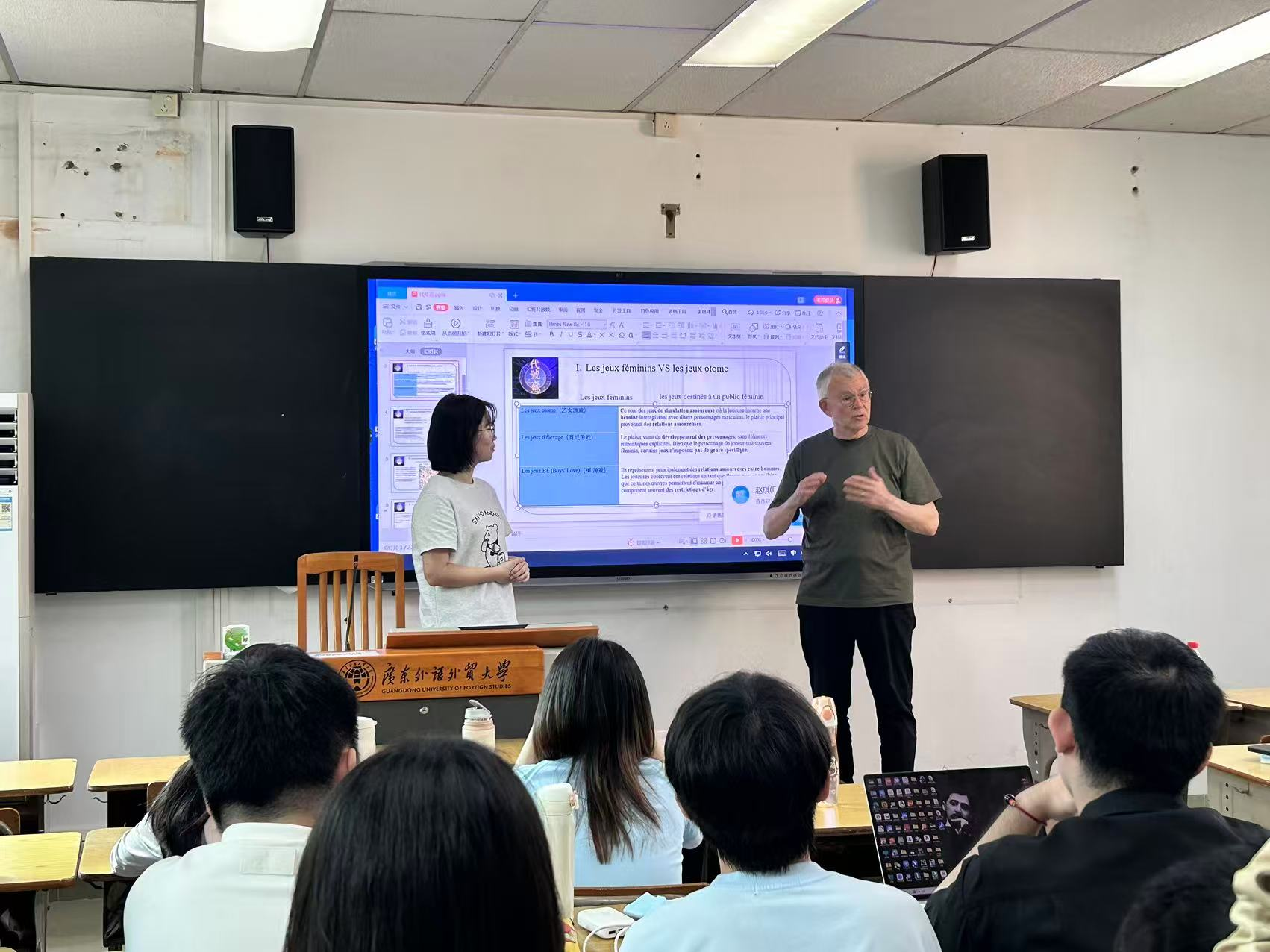 本网讯 2025年5月22日,广东外语外贸大学迎来了一场别开生面的中法文化交流活动。法国著名人类学家戴泽教授Dominique Desjeux受邀与2024级法语语言文学硕士生展开主题为“Mon histoire avec les jeux”(我与游戏的故事)的文化分享,通过游戏、美食与娱乐的多元互动,架起跨文化理解的桥梁。