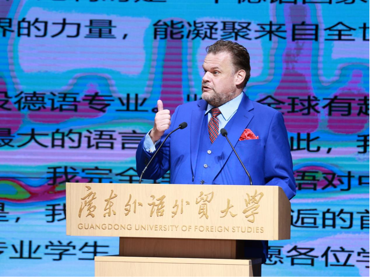 比利时驻广州总领事裴伟岷在致辞中提到,比利时德语区拥有独立教育体系与文化机构,比利时与德、法等邻国基本形成了无边界的紧密合作。他重点传递了两个关键信息:一是比利时为德语国家身份自豪,二是文化具有超越国界的凝聚力量。他肯定了广外开设德语专业的意义,特别祝贺广外德语专业60周年,勉励学子在挑战中成长,让语言成为连接世界的纽带。