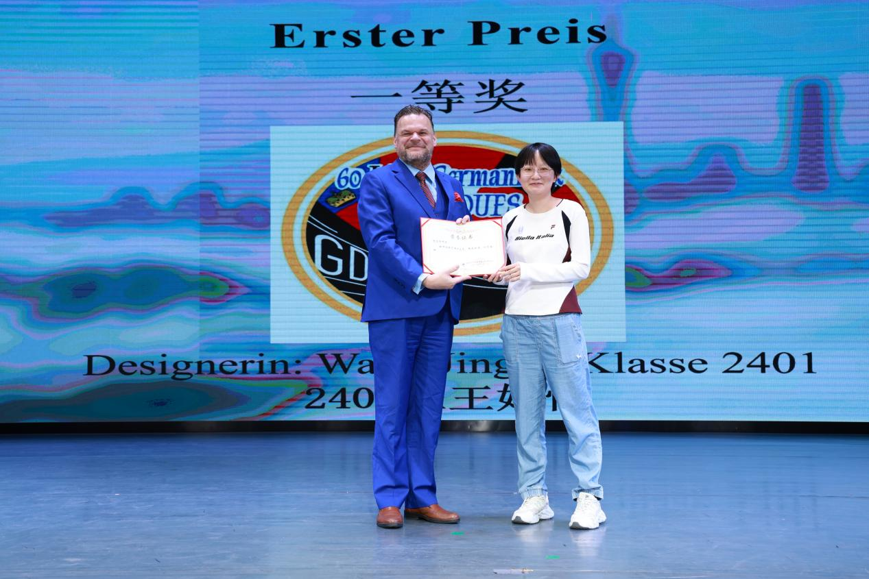 文艺表演间隙,德语系60周年庆logo设计评选颁奖仪式顺利举行。裴伟岷总领事担任颁奖嘉宾,为在此次logo设计评选中脱颖而出的三位获奖同学颁发荣誉证书,并与获奖学生亲切合影留念。