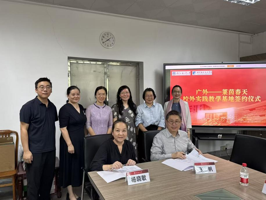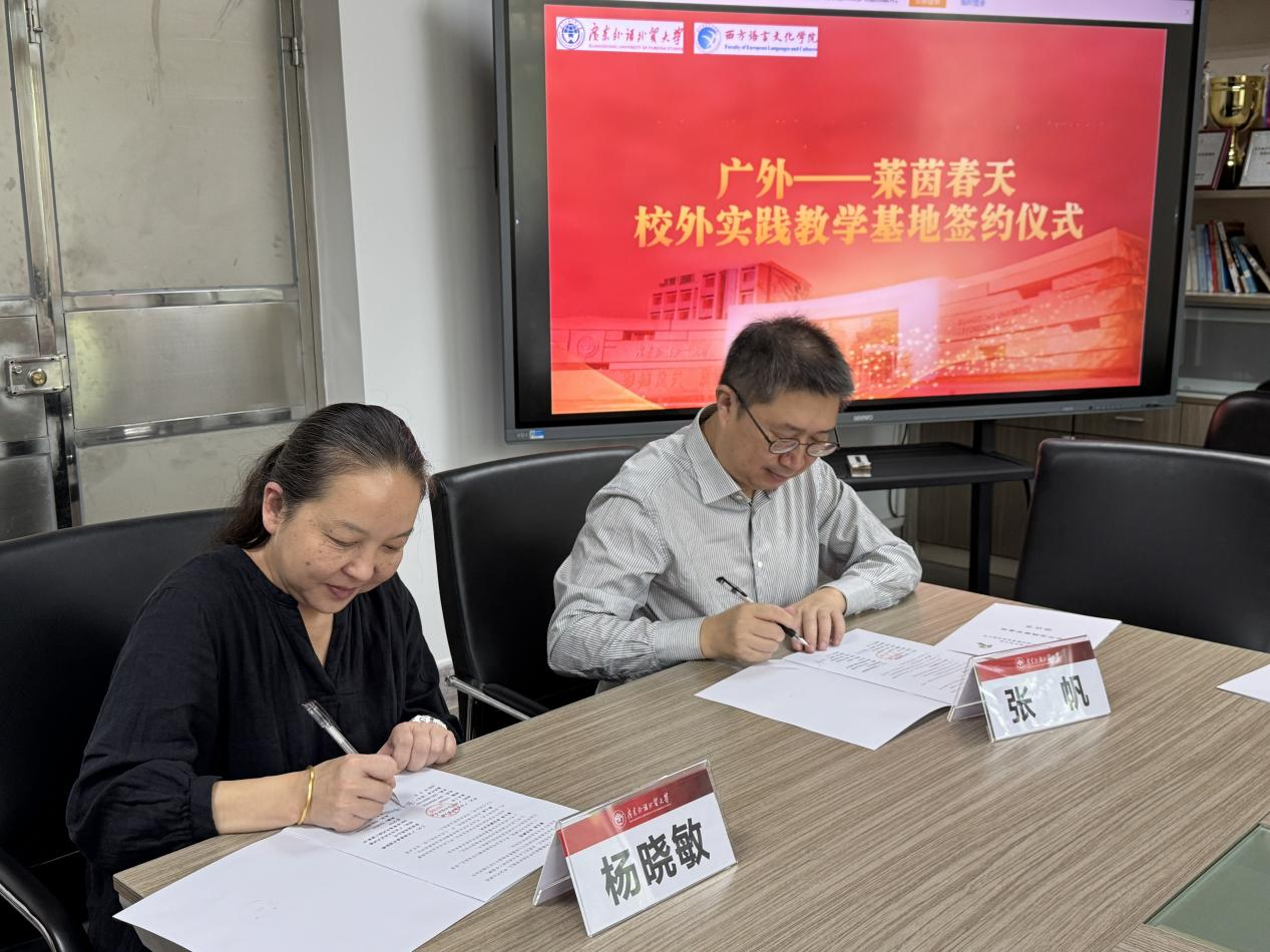 本网讯 2025 年 10 月 20 日,广东外语外贸大学与莱茵春天国际教育正式签约,共建广东外语外贸大学校级校外实践基地。签约仪式上,西方语言文化学院院长杨晓敏与莱茵春天教育创始人、广外德语系88级校友张帆代表双方签署合作协议。莱茵春天国际教育资深教师李享,西方语言文化学院党委书记王秀民、副书记魏少娟、副院长卢铭君,德语系主任吴晓钢及滕奕丹、张思源老师出席见证。双方围绕校企合作细节深入沟通,最终达成深度共识。