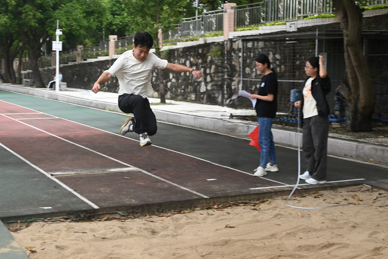 加速,冲刺,踏板腾空。沙坑不是终点,而是另一个起点。每一次奋力前跃,都离胜利更近一尺。祝贺西双2401贾馥源同学、法双2401黄泽宇同学和葡语2401孙驿博同学夺得男子跳远前三!他们的每一次腾跃,都用实力丈量着青春的广度。