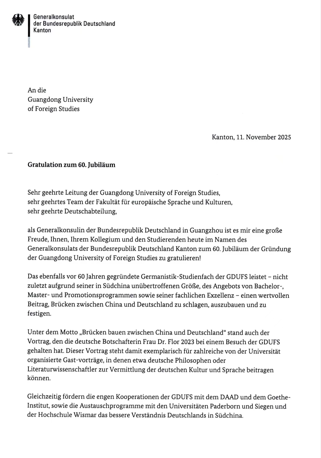 六十载耕耘不辍,一甲子桃李芬芳。2025年,广东外语外贸大学迎来建校六十周年华诞,其德语专业亦于同期创立,与学校同频共振,深耕中德交流六十载。值此盛事,德意志联邦共和国驻广州总领事馆总领事万玉凤博士(Dr. Josefine Wallat)发来贺信,代表总领事馆向广外及全体师生致以热烈祝贺。