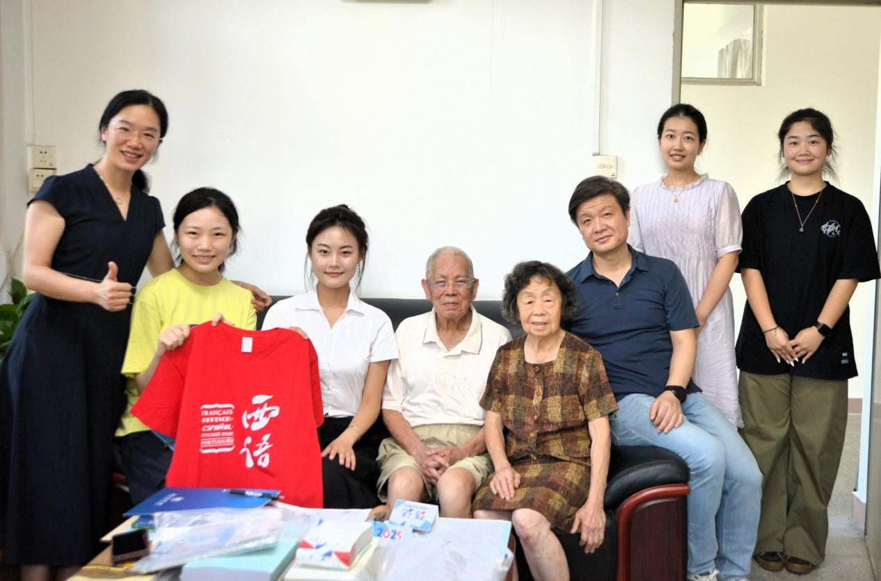 9月11日下午,西语学院党委副书记魏少娟带队,法语系系主任叶剑如、学院团委书记冯迪南及法语系大一、大二学生代表一行,专程前往广外原校长黄建华教授的办公室。师生们怀着崇敬之心,代表全院师生向黄校长及其夫人余秀梅老师致以教师节最诚挚的祝福与亲切问候。这场跨越代际的会面,不仅是对老一辈广外人深耕教育、坚守初心的致敬,更让青年师生得以近距离聆听前辈关于语言学习、学术探索的宝贵经验,汲取砥砺前行的精神力量。