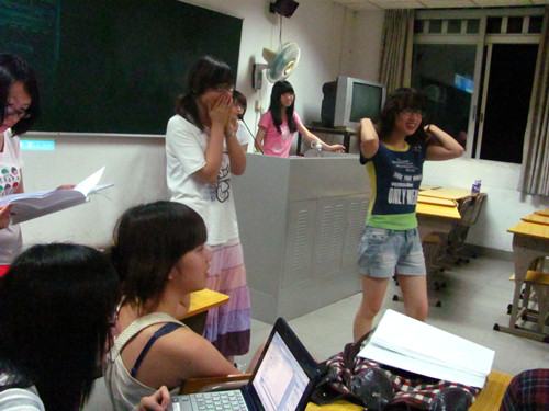 对于《楼梯的故事》团队里的每一位导演和演员们,这台剧意味着太多的东西,他们感觉自己不仅有义务而且有责任为大家呈现出一台完美的戏剧。也许这就是他们为什么能在学习之余抽出宝贵的时间,毫无怨言地准时参加每一场排练和联排。在排演中,他们中的每一位演员都融进了自己的角色,一颦一笑,都是发自内心,如此的自然。当然,他们也遇到了不少难题。男演员不够,我们的女生们就反串男角,她们用精湛的演技征服了剧组的所有成员。而幕后的配音演员们则用他们惊艳的配音向我们阐述了他们与舞台上的演员们的高度默契。同演员和导演们一样辛苦的还有,团队的幕后人员,据道具组的成员们透露,为了制作出演出需要的道具,就花了一个多月的时间,而这些道具无一例外的都是他们自己手工制成。