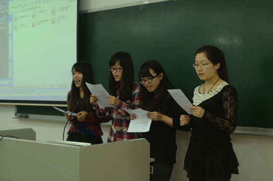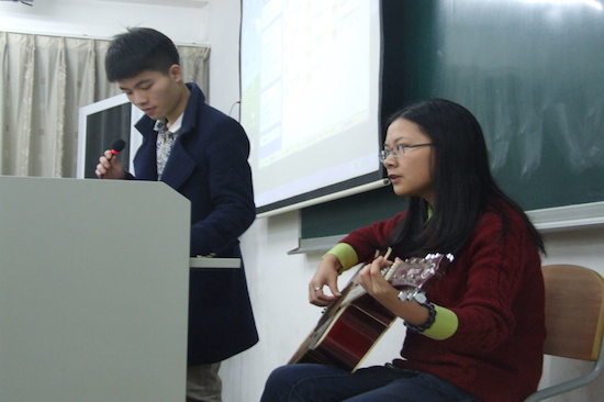 表演形式也有所创新,独唱,合唱与现场伴奏等顿时点燃了全场热情。比赛最后邓玮老师评价说同学们都唱得很好,在唱歌的同时也锻炼了语音语调。