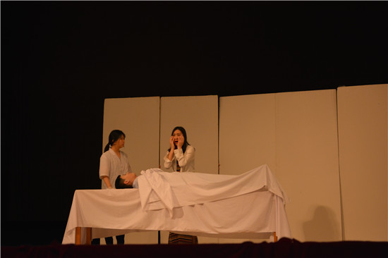 接下来是西语剧组给我们带来了悬疑剧《茱莉亚的眼睛》,戏剧讲述了勇敢的女主人公Julia试图为死去的妹妹找到那个杀害她的“隐形人”——护士伊万,并揭开了杀人犯扭曲黑暗的心理。戏剧一开始便笼罩着诡奇的氛围,悠扬灵异的音乐游走在那栋灯光晦暗的老宅,灯光音效随情节的发展扑朔迷离,紧张惊恐的氛围扣人心弦。不仅如此,演员汪玥细致地用表情与肢体动作,十分到位地表现了女主角Julia的恐惧心理,得到观众的一致好评。