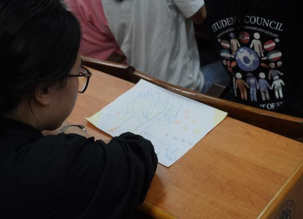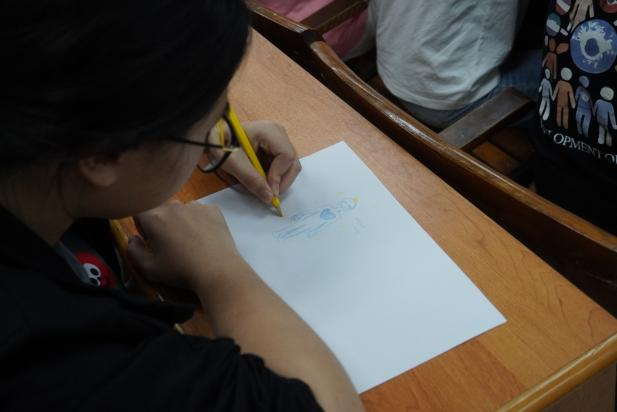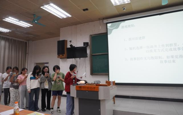在冥想聚焦内心状态环节中,付蒙带领同学们通过冥想来感知自己的身体和内心的状态,从而在冥想中开始和自己的潜意识进行连接。冥想结束后,通过绘画接龙和看图故事接龙的方式,带领同学们感受游戏的趣味性和体验艺术创作。在游戏进行的过程中,同学们或专注于手中的画笔,在空白的画纸上尽情挥洒着自己的创意,或认真倾听着他人创作的故事,或积极地站在台前分享着自己创作的故事。活动氛围轻松和谐,大家时不时被诙谐而又有趣的故事所感染,一起发出快活的欢笑声。