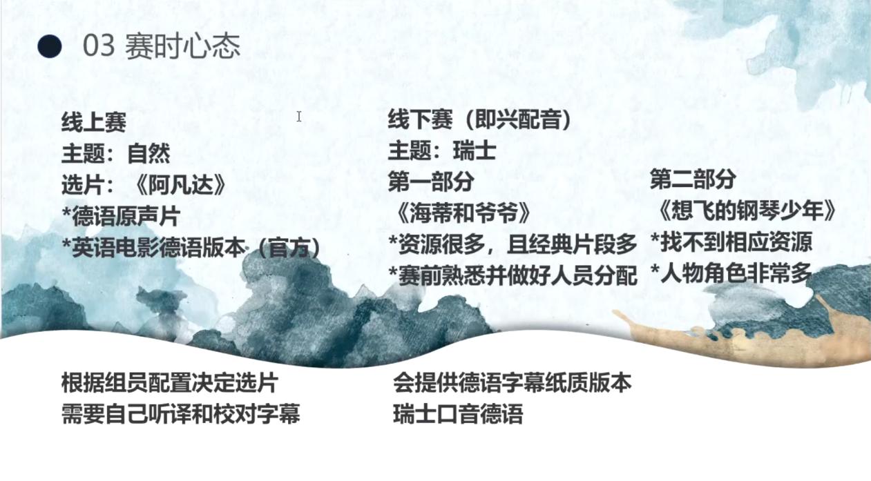 在分享团队协作的经验时,练丰仪同学详细讲解了如何组建并高效运营参赛团队。她建议同学们选择有经验的队友,并在团队内部明确分工,以确保从选题到最终成品的有序推进。她特别提到,德语配音比赛需要选手选择适合主题的影视作品,优先采用官方德语版本,并结合专业技术提升视频质量。关于比赛心态管理,她指出线上赛和线下赛各有特点,参赛者需灵活应对,并在比赛中保持自信与沉着。