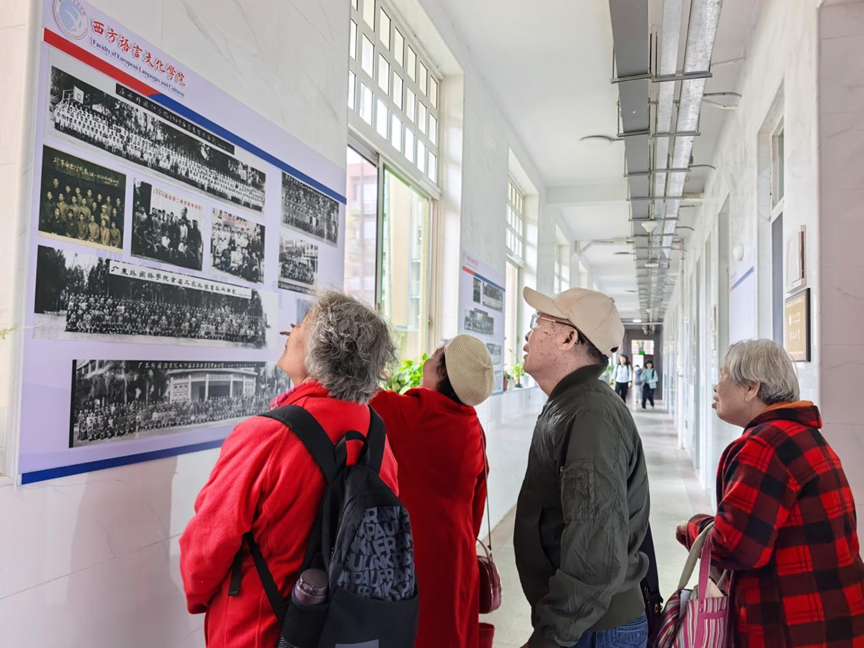 恰逢课间,走出教室的同学们注意到这群特殊的老人,轻声向老师询问:“他们是哪一届的校友呀?”当得知眼前的老人是广外建校第一届学生时,同学们瞬间肃然起敬,亲切地向“大师兄”“大师姐”问好。老人们也格外欣慰,拉着同学们的手夸赞同学们长得好、精气神更好!校园里的新老两代人,在“时光校影”长廊里,在这一刻完成了一场跨越六十年的情感对话。